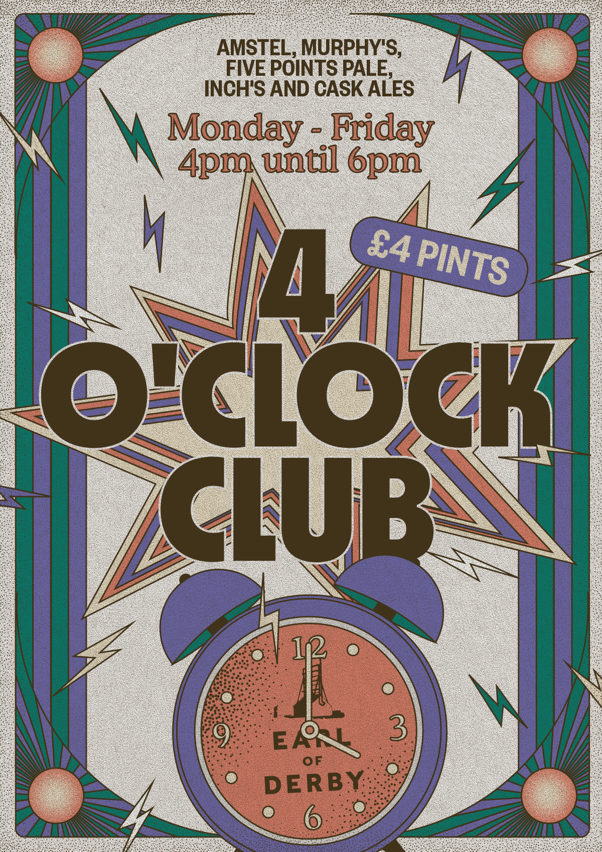 Welcome to the 4 0’CLOCK CLUB where Amstel, Five Points Pale, Inch’s Cider, Murphy’s Irish Stout and all cask ales pints are £4! Monday – Friday, 4pm – 6pm. Cheers!