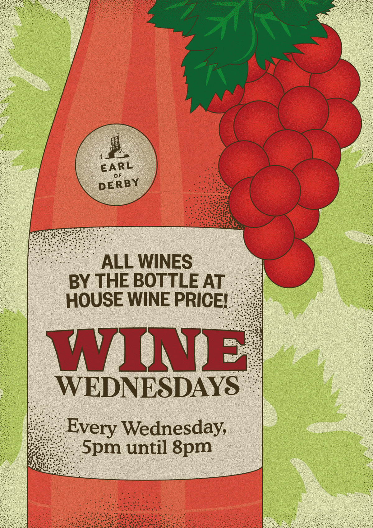 WINE WEDNESDAYS is your midweek motive – all wines by the bottle at House Wine price! Every Wednesday, 5pm – 8pm. El vino will flow. If that wasn’t enough, every third Wednesday of the month it’s the Earl of Derby NOVELLA BOOK CLUB. Hosted by Sam of the award winning Burley Fisher Books, it starts at 8pm upstairs. Ask at the bar what this months book is!